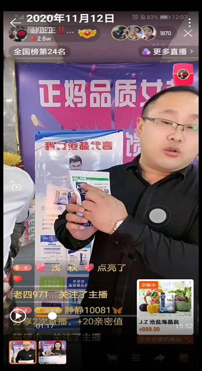 銀山食鹽公司銷售科副科長郭帥負(fù)責(zé)相關(guān)業(yè)務(wù)聯(lián)系,并全程跟進(jìn)、及時(shí)溝通、全力配合快手平臺開展工作。在“雙節(jié)”期間,曾一度因銷售火爆導(dǎo)致客服無法滿足售后服務(wù)。從直播帶貨至今,歷時(shí)20多天的時(shí)間里,共計(jì)銷售“滄鹽”牌小包裝食用鹽500余噸,其中海晶鹽107噸、精晶海鹽200噸,粉碎洗滌鹽200噸,開創(chuàng)了線上主播帶貨銷售的先河,成為敢于在線上(快手平臺)食鹽銷售第一個(gè)“吃螃蟹”的人。