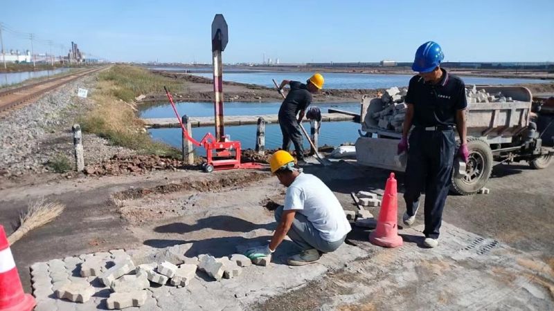 9月29日,建筑工程公司施工科職工早早來到施工現(xiàn)場(chǎng),提前準(zhǔn)備好發(fā)電機(jī)、水泥、連鎖塊、沙子、石子等工具材料,通過對(duì)現(xiàn)場(chǎng)勘查,制定出修補(bǔ)辦法。按照修補(bǔ)方案,職工們開始了道路修補(bǔ)工程。修補(bǔ)施工現(xiàn)場(chǎng),一派忙碌的景象,職工們有砌磚的、有拌灰的、有灌縫的,電鎬的沖擊聲、發(fā)電機(jī)的轟鳴聲與職工忙碌的身影交匯在一起,成為一道亮麗的風(fēng)景線。