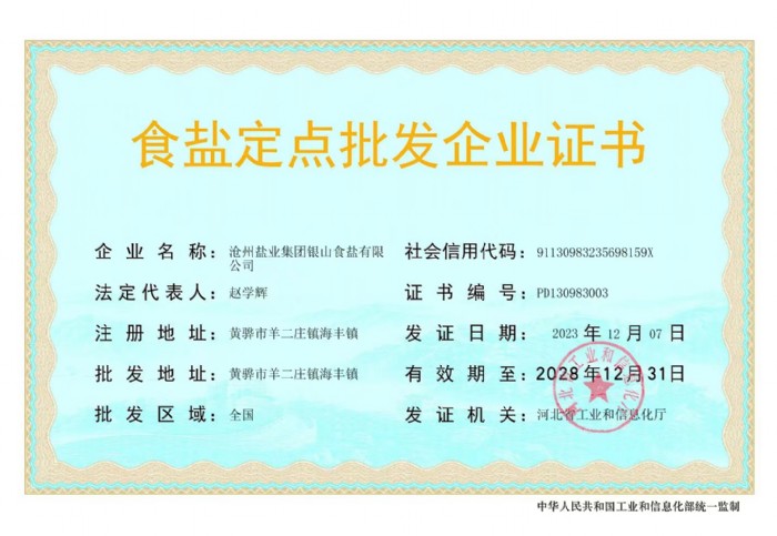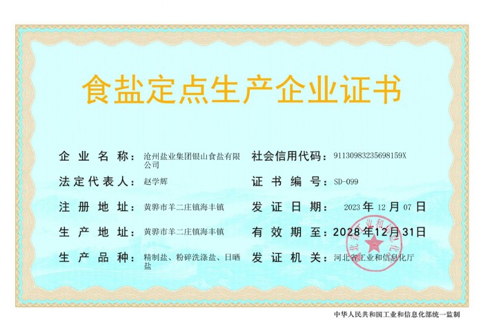 近日,銀山食鹽有限公司順利完成食鹽定點(diǎn)生產(chǎn)企業(yè)(證書編號(hào)SD-099)和食鹽定點(diǎn)批發(fā)企業(yè)(證書編號(hào)PD130983003)兩證審核換發(fā)工作。12月19日,河北省工業(yè)和信息化廳向銀山食鹽有限公司頒發(fā)了新?lián)Q發(fā)的兩個(gè)證書。