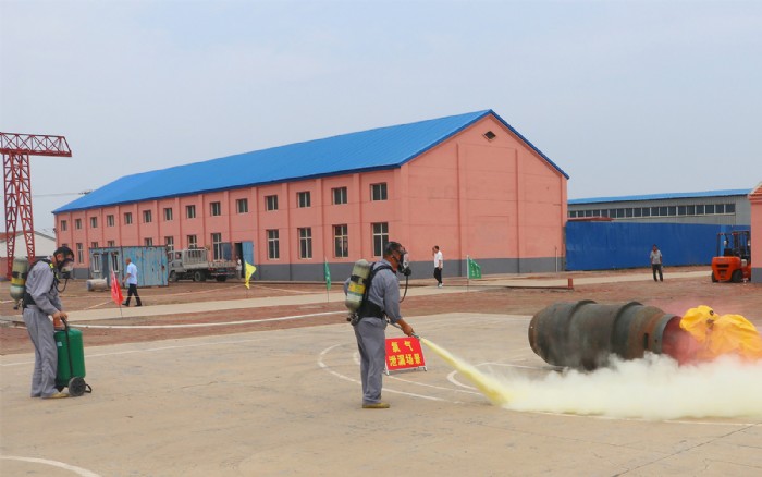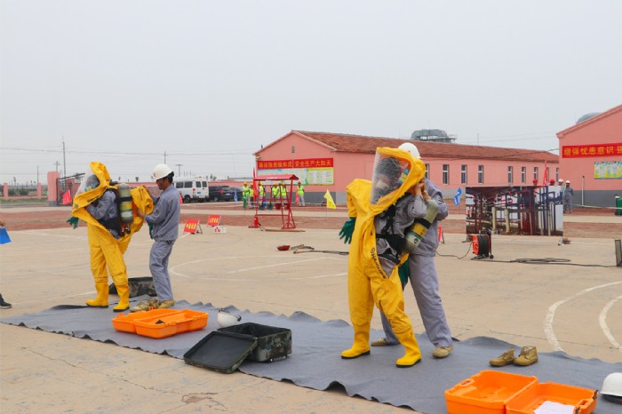 此次演練模擬了機械傷害、中暑、觸電、火災(zāi)、溴素燙傷、氯氣泄漏六個事故場景。演練開始前,進行了空呼機穿戴、全封閉防化服穿戴、空呼機穿戴30米跑、消防等技能比武活動。