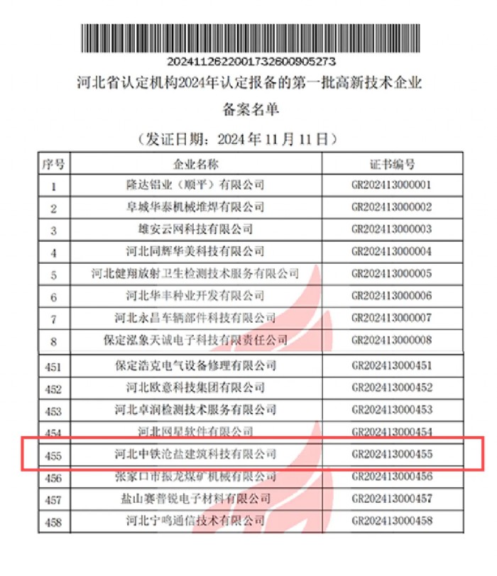 近日,河北中鐵滄鹽建筑科技有限公司順利通過了國家高新技術(shù)企業(yè)復(fù)審,并于2024年11月27日取得了新版“國家高新技術(shù)企業(yè)”證書。
