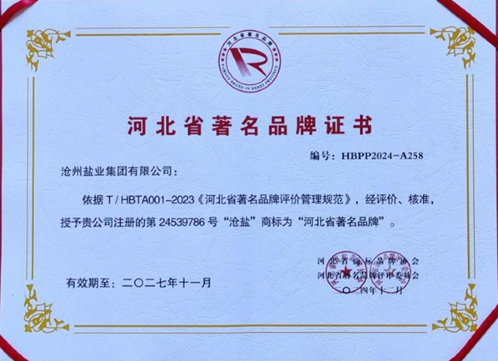 近日,河北省商標(biāo)品牌協(xié)會組織開展的2024年度“河北省著名、知名、優(yōu)秀品牌”評選結(jié)果正式揭曉,經(jīng)過嚴(yán)格的評審和篩選,滄州鹽業(yè)集團有限公司注冊號為24539786的“滄鹽”牌商標(biāo)被評定為“河北省著名品牌”,滄州鹽業(yè)集團有限公司被授予“河北省商標(biāo)品牌協(xié)會副會長單位”。
