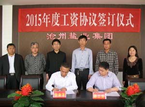 4月29日上午,公司舉行2015年度工資協(xié)議簽訂儀式,企業(yè)方首席代表、董事長(zhǎng)劉建軍,職工方首席代表、工會(huì)主席李金營(yíng),分別在協(xié)議書上簽字。
