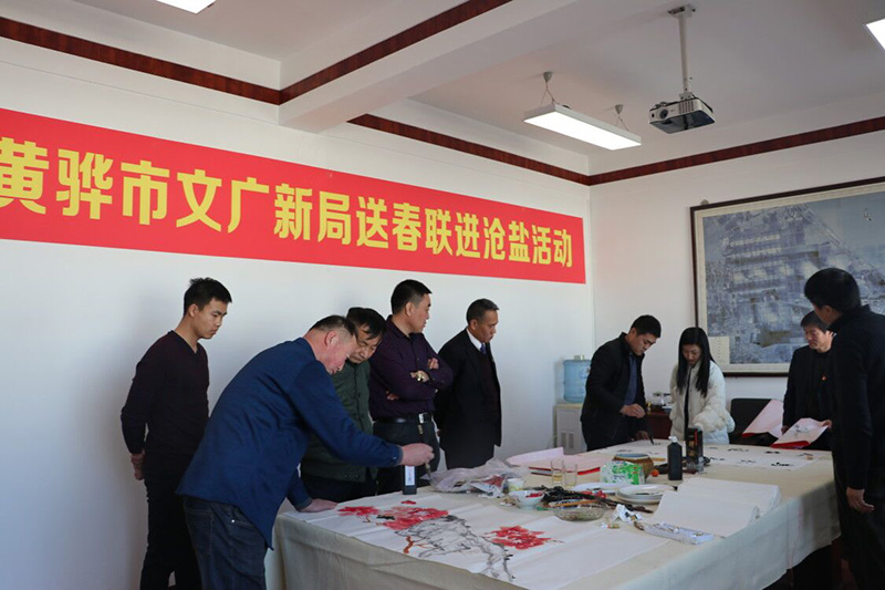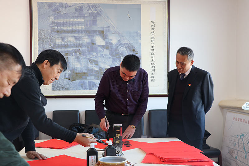 2月2日,黃驊市文廣新局組織本市6位知名書畫家到公司開展“送春聯(lián)·進(jìn)滄鹽”活動(dòng)。在活動(dòng)現(xiàn)場,書畫家們潑墨揮毫、妙筆生花,不僅書寫了100余幅象征幸福團(tuán)圓的福字和春聯(lián),而且深情地描畫出象征富貴吉祥的“牡丹圖”等繪畫作品,營造出喜慶祥和的節(jié)日氛圍。
