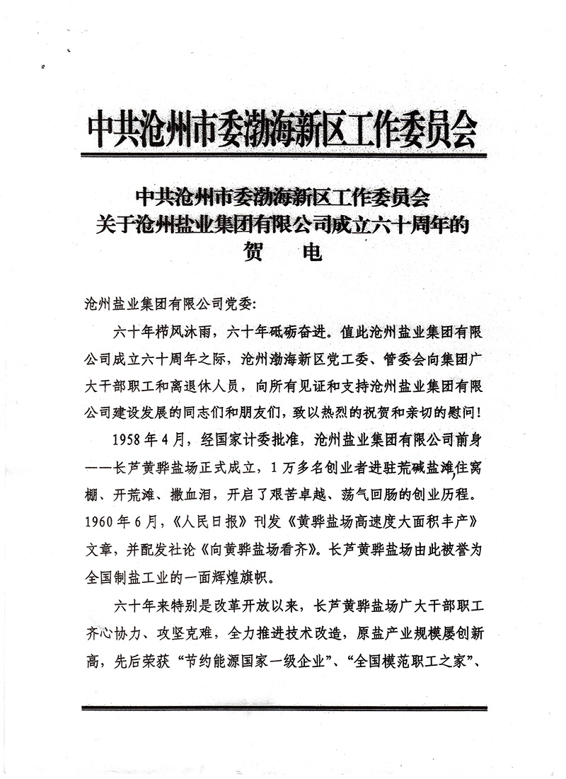 滄州渤海新區(qū)黨工委、管委會(huì)發(fā)來(lái)賀電,對(duì)公司成立六十周年表示祝賀,對(duì)公司過(guò)往取得的輝煌成就予以充分肯定,并寄望滄鹽集團(tuán)繼續(xù)發(fā)揚(yáng)滄鹽精神,深化改革,加快推進(jìn)轉(zhuǎn)型升級(jí),助力滄州渤海新區(qū)高質(zhì)量發(fā)展。